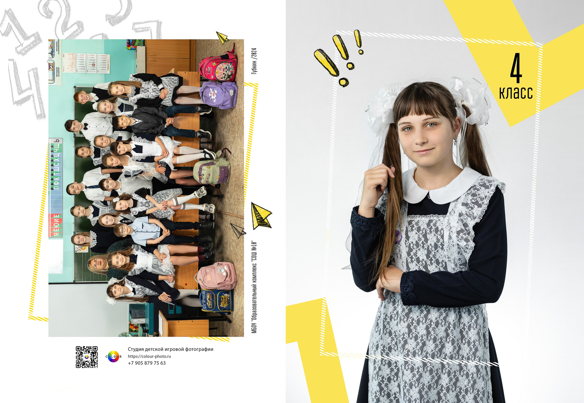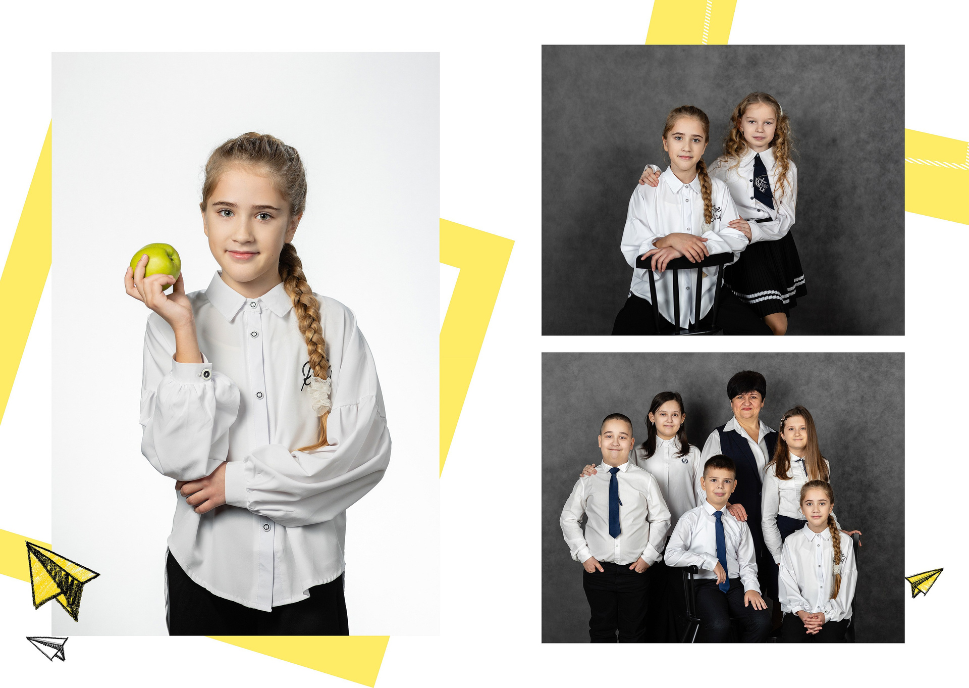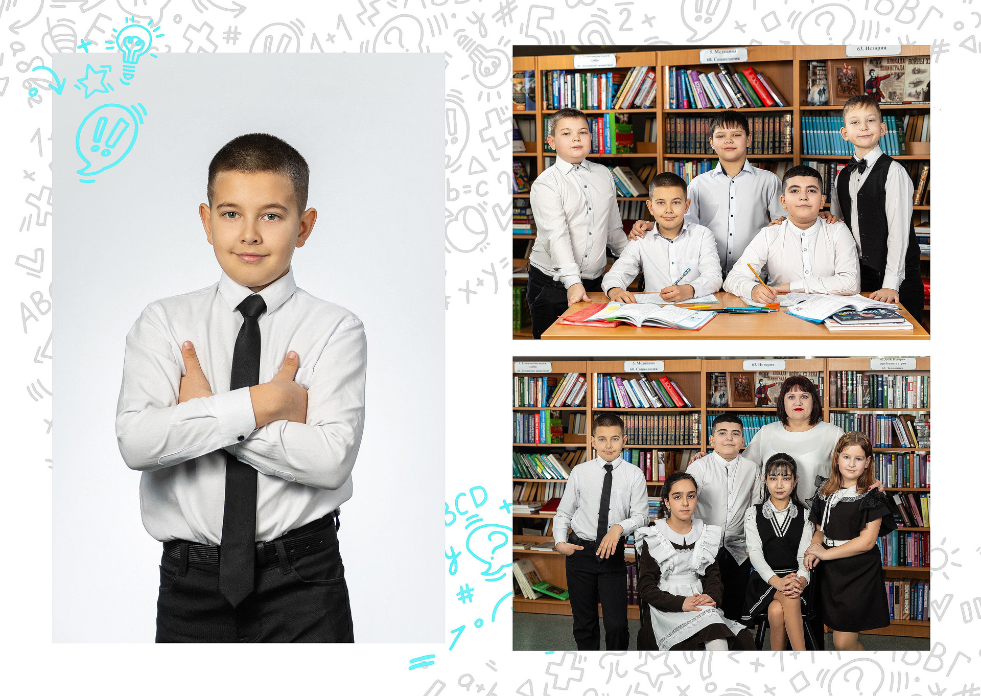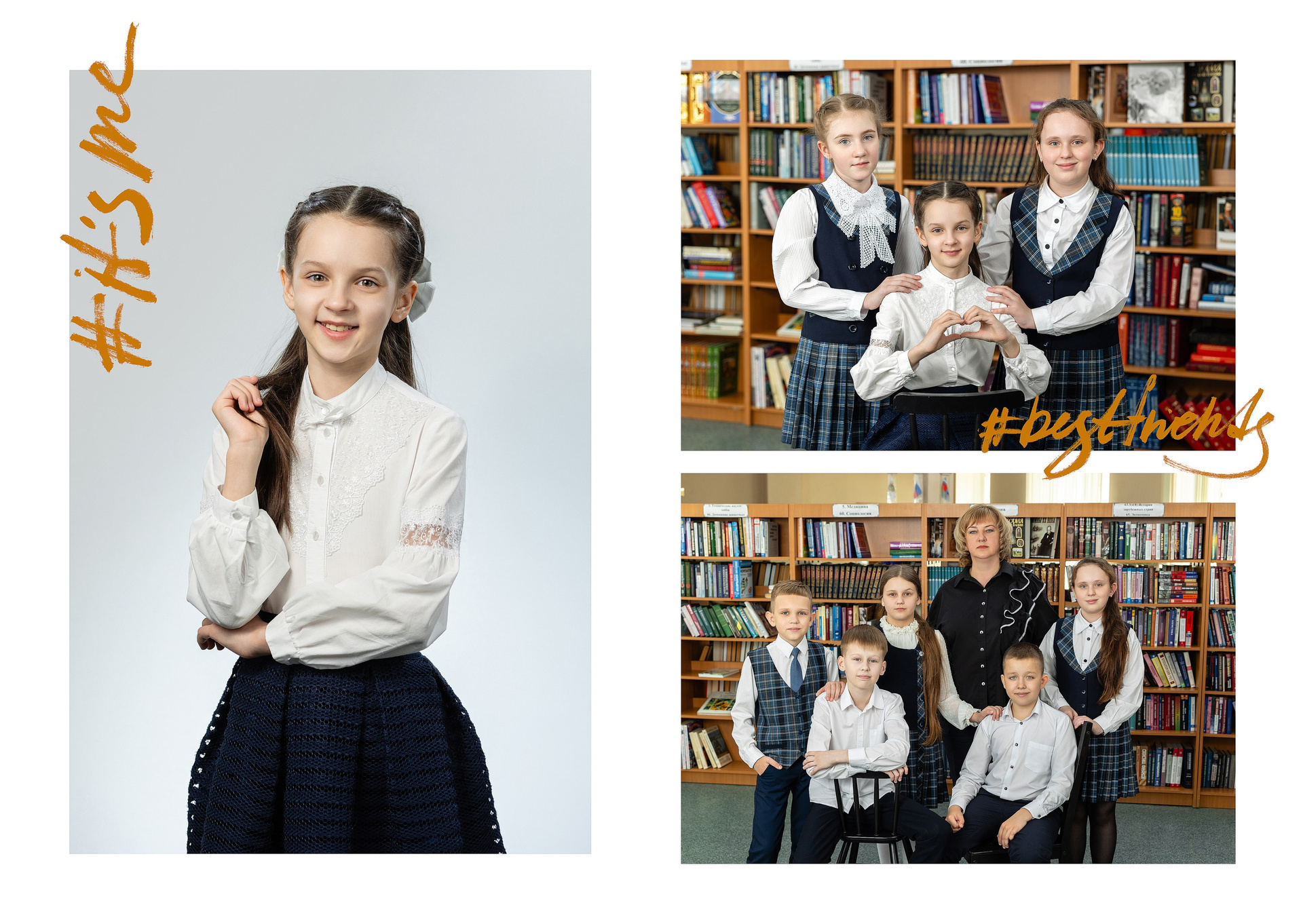 - 1-й разворот: 2 портрета ребенка/ портрет ребенка, фотографии с его друзьями, с одноклассниками и учителем