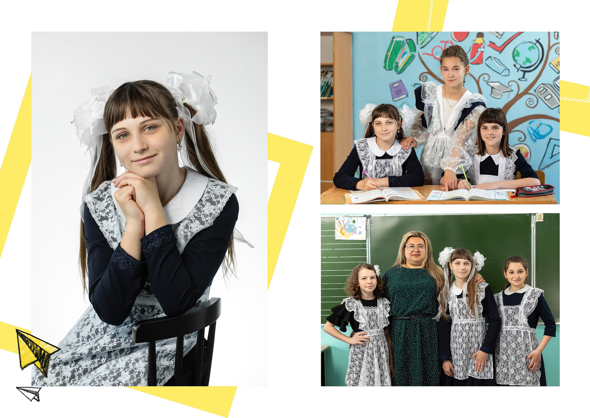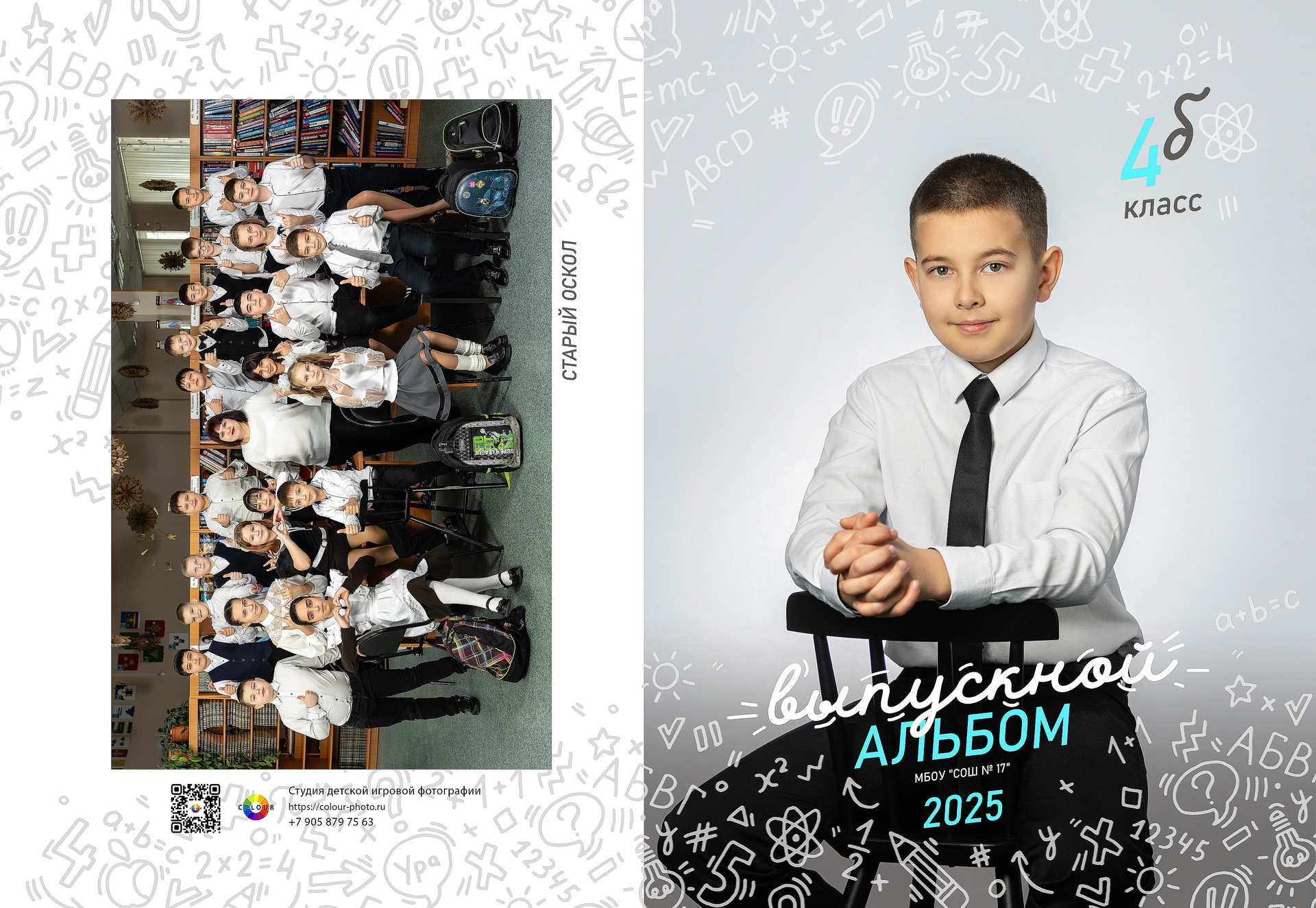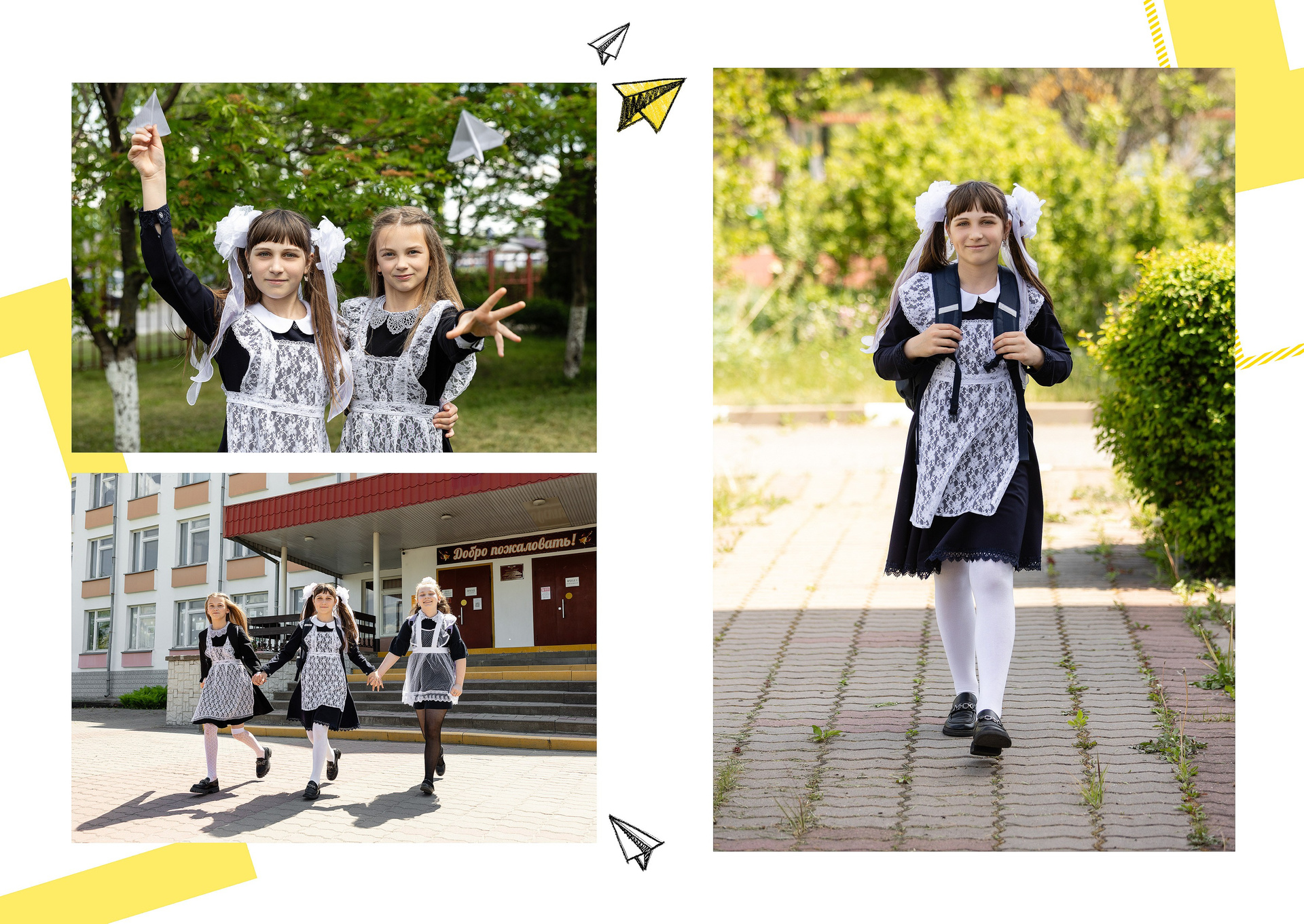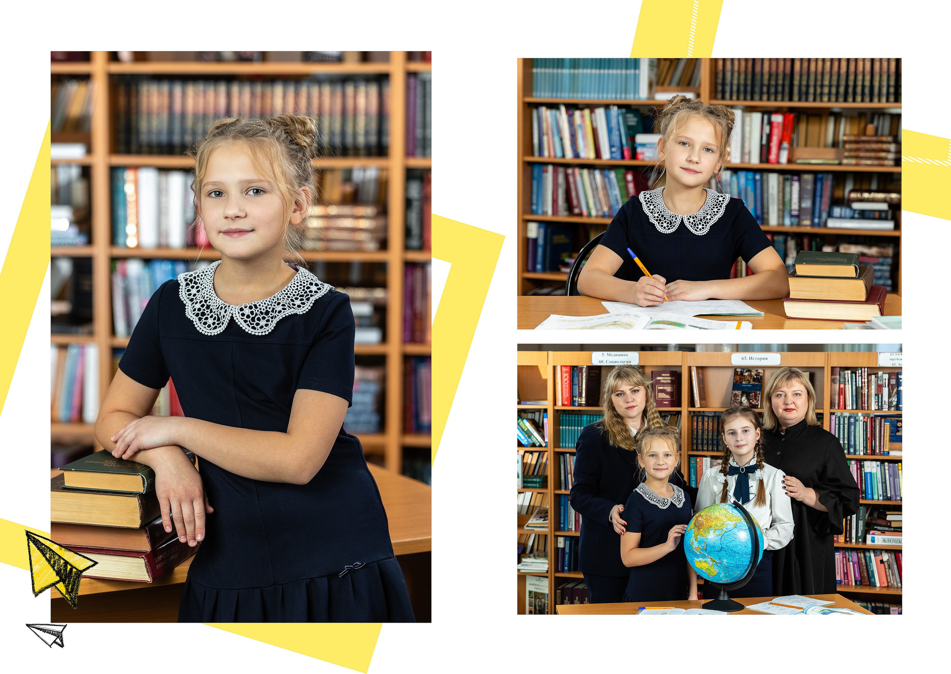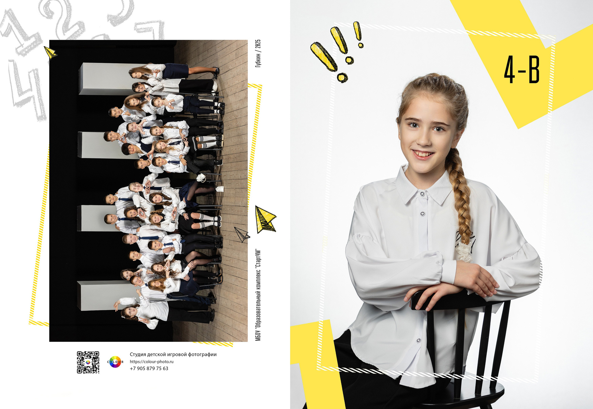 - 1-й разворот: 2 портрета ребенка/ портрет ребенка, фотографии с его друзьями, с одноклассниками и учителем