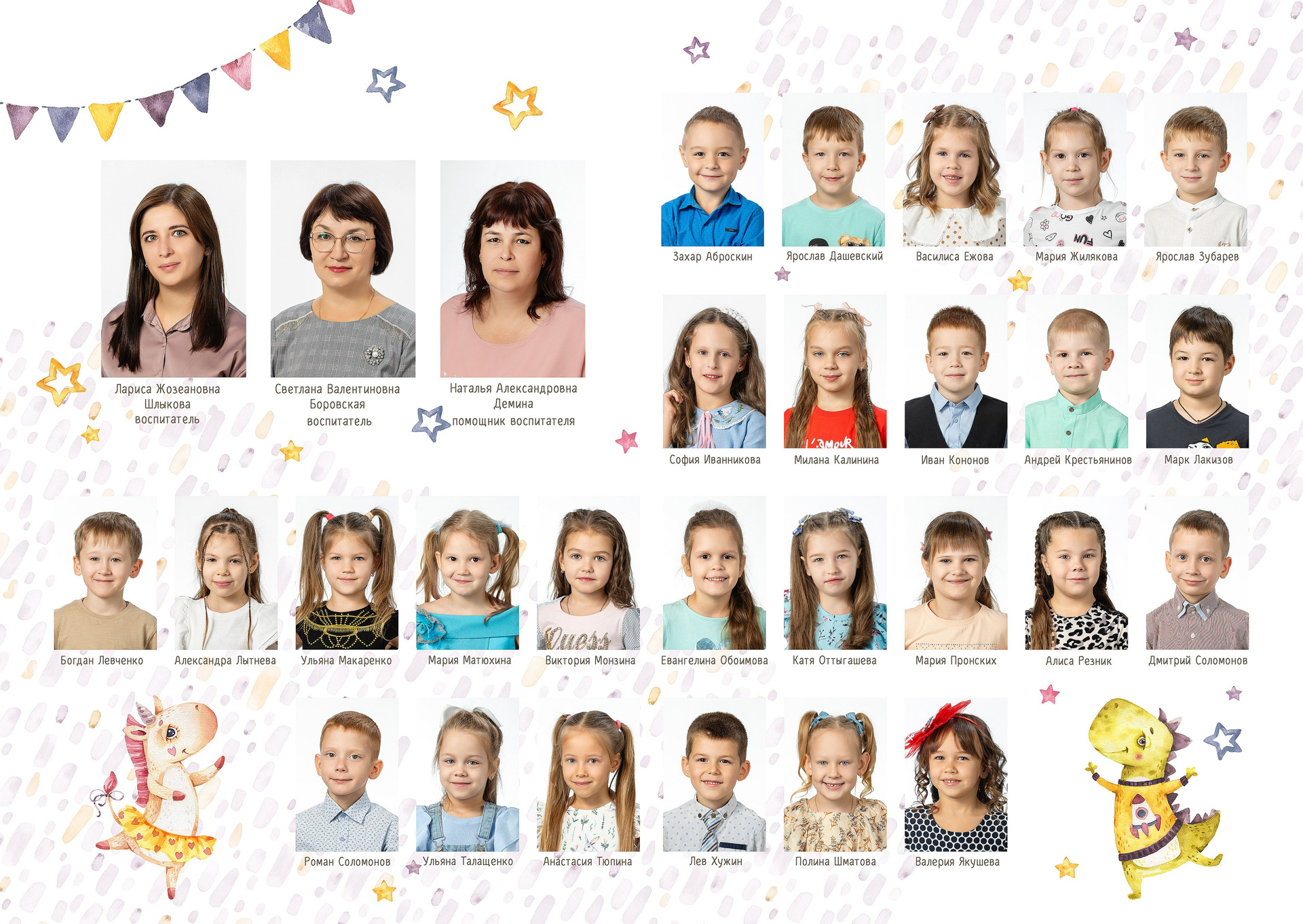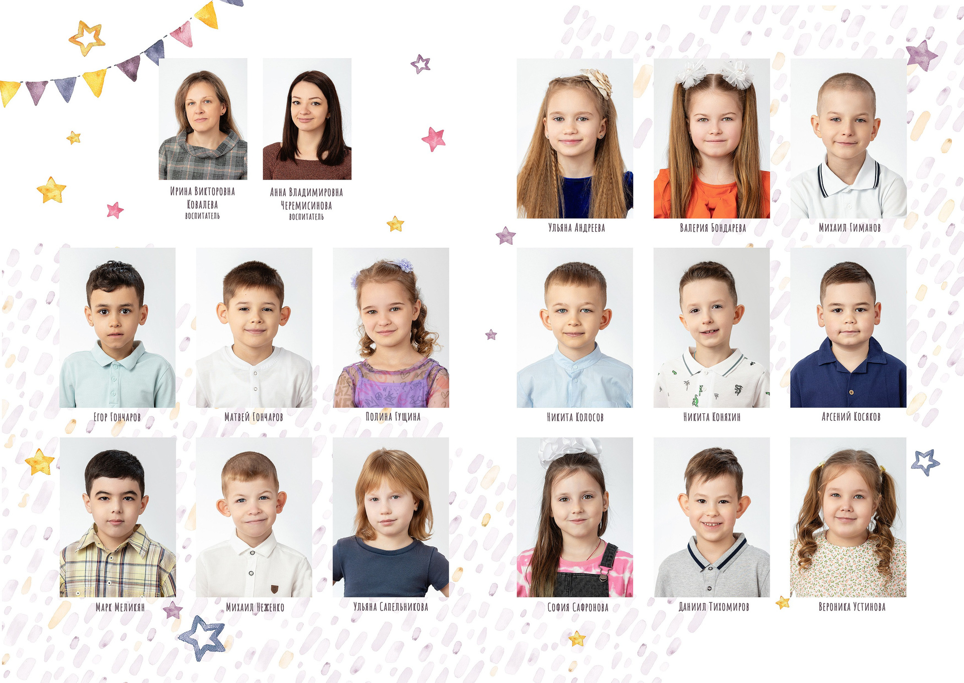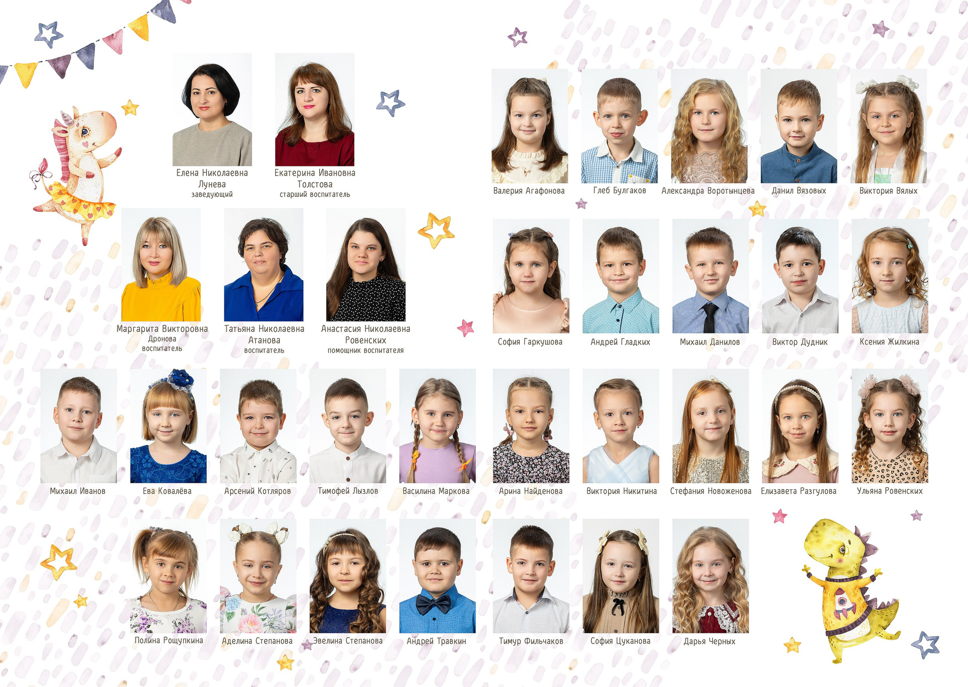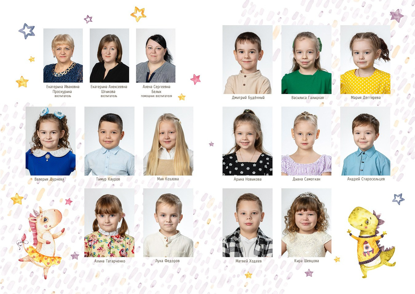- 2 страницы — групповое фото (коллаж из портретов с именами детей и педагогов)