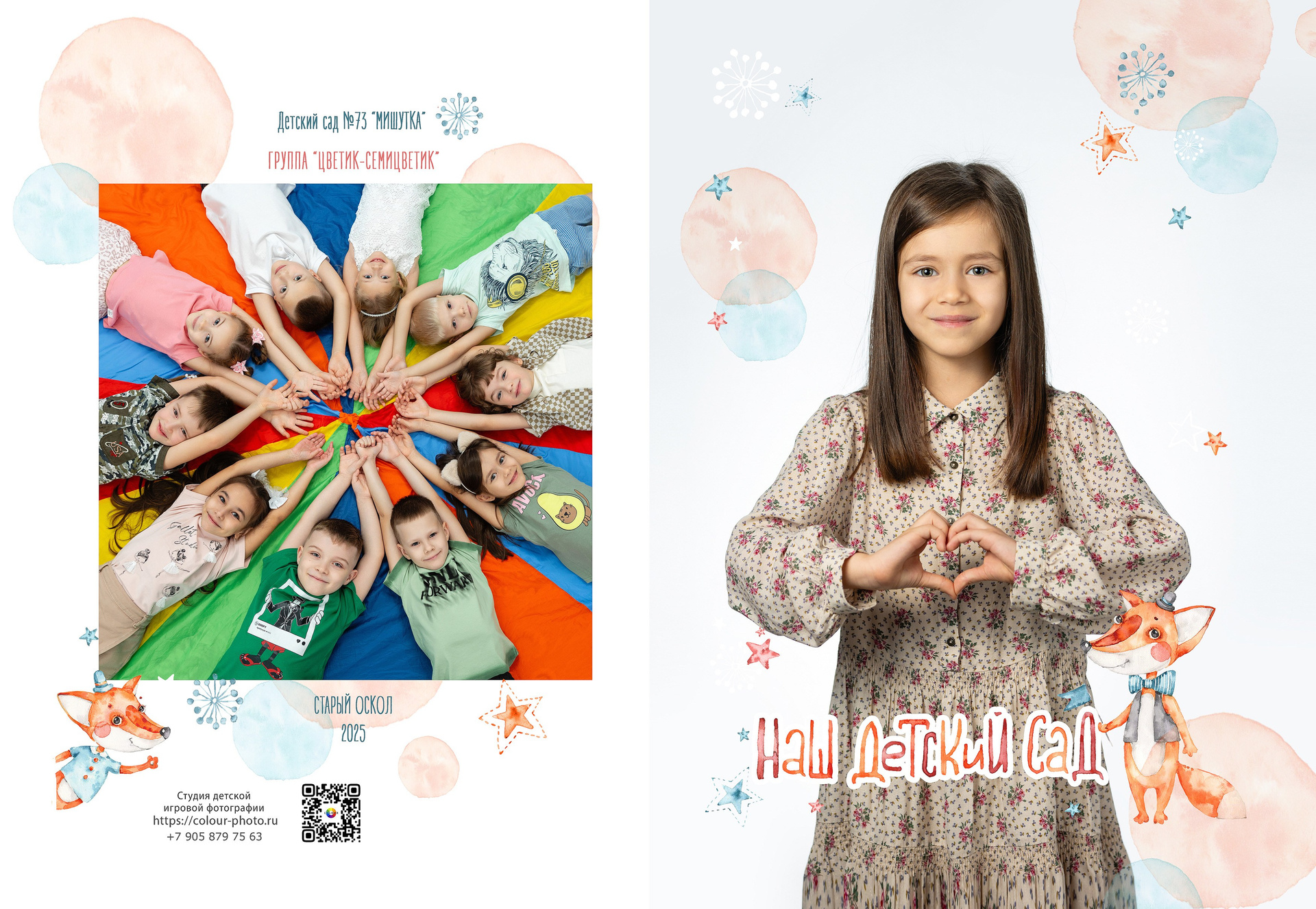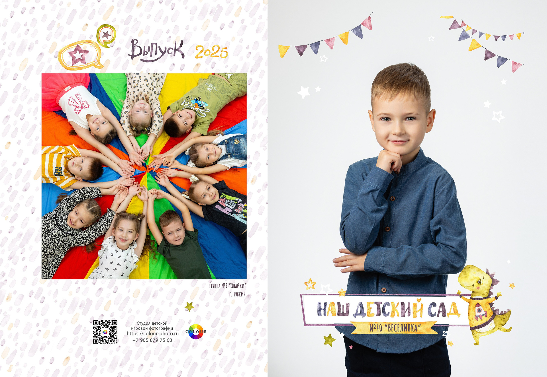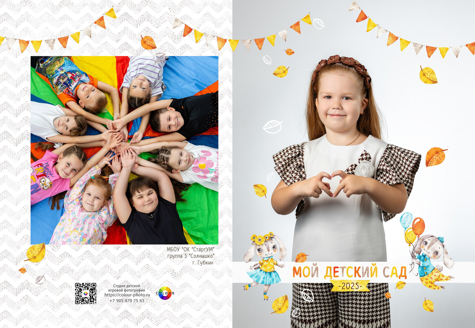 - 2 страницы — групповое фото (коллаж из портретов с именами детей и педагогов)
