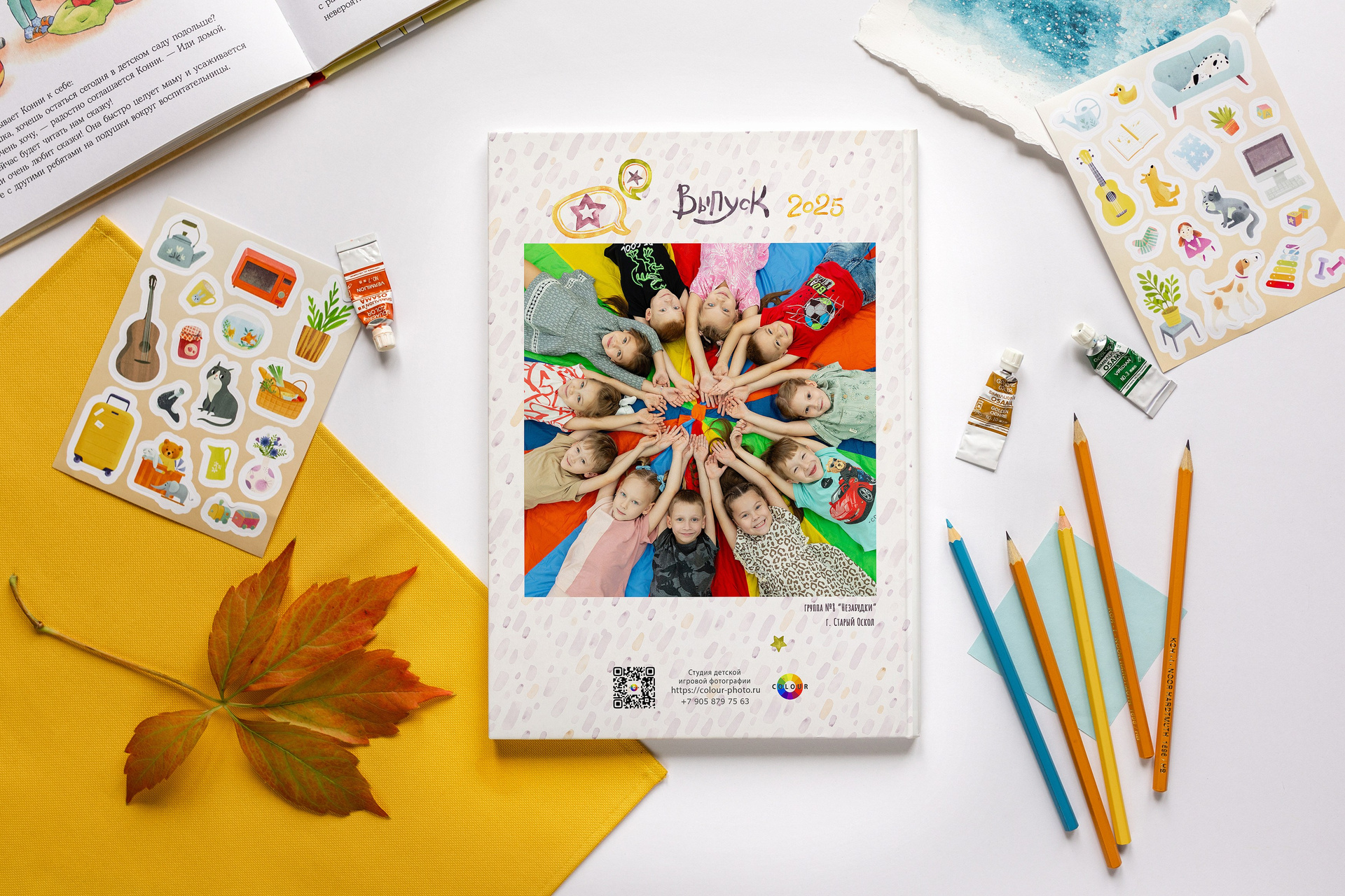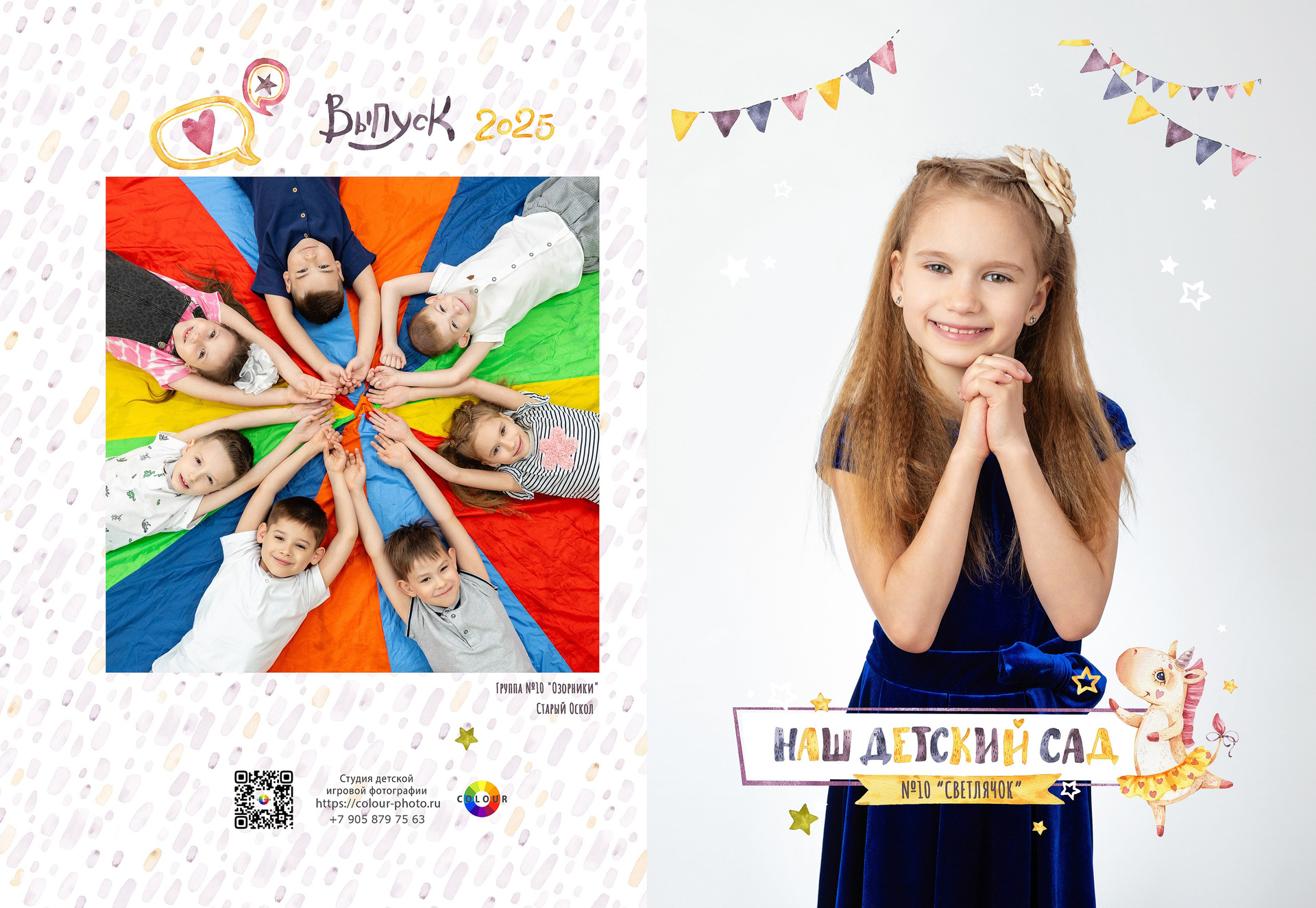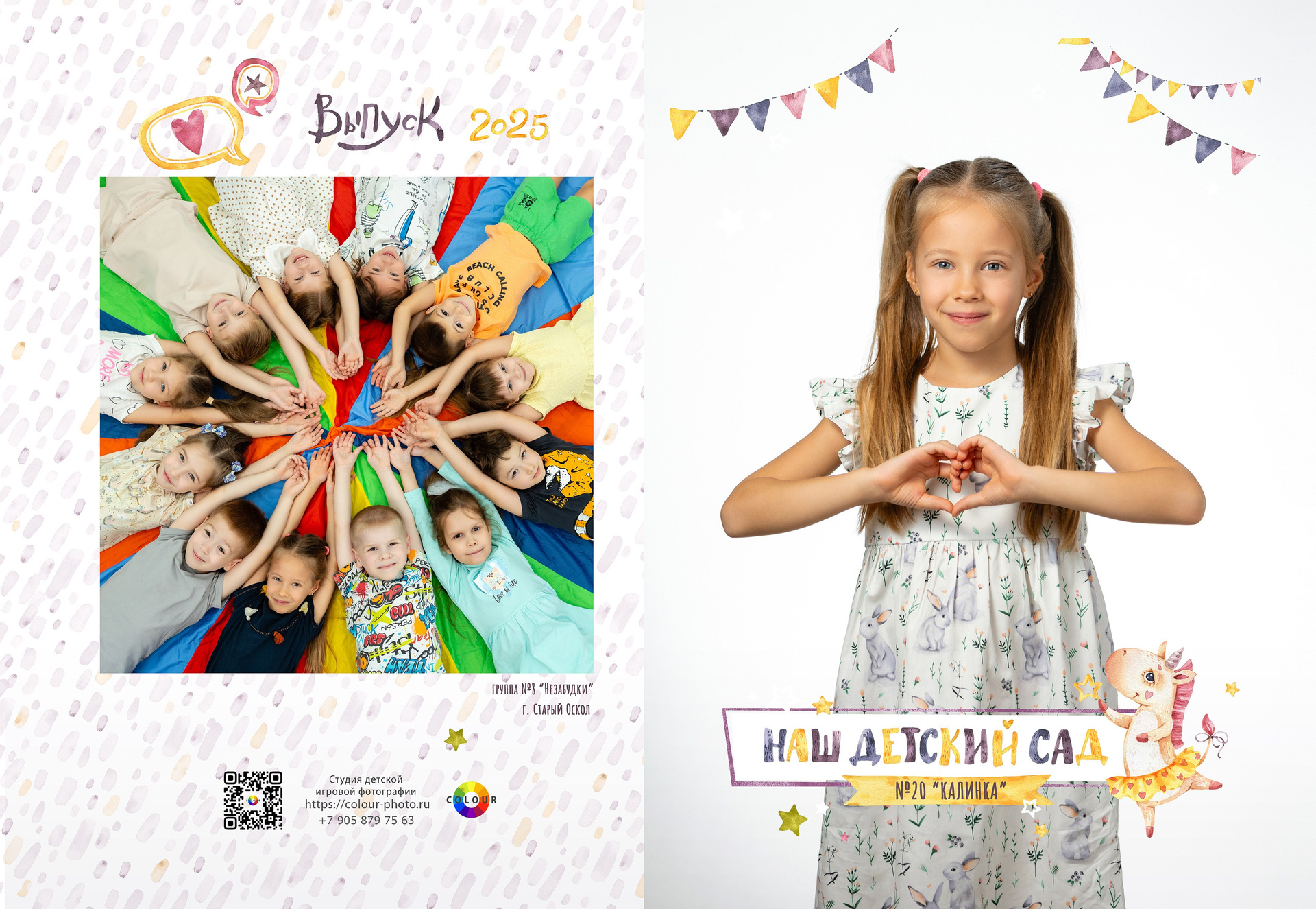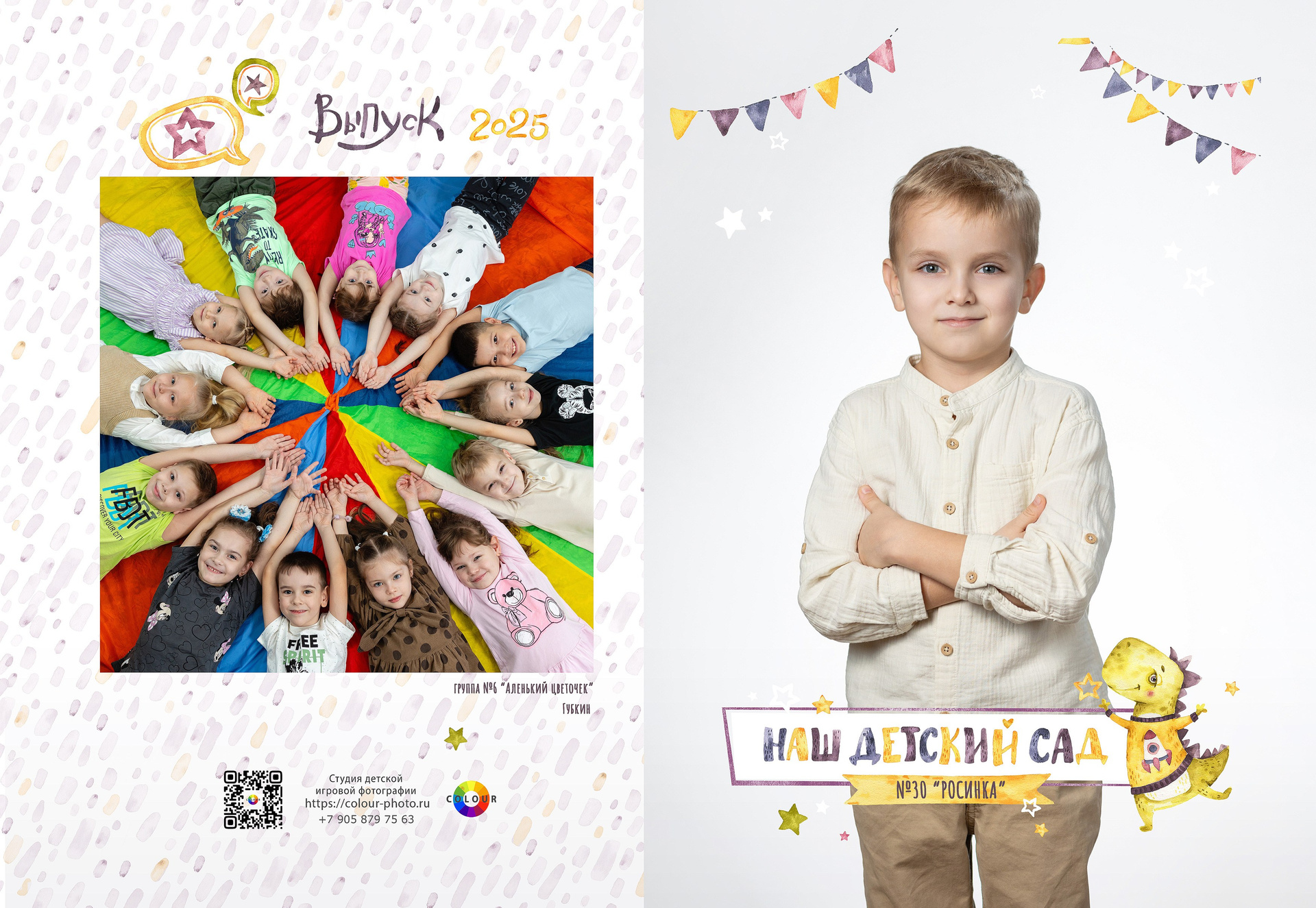 - 2 страницы — групповое фото (коллаж из портретов с именами детей и педагогов)