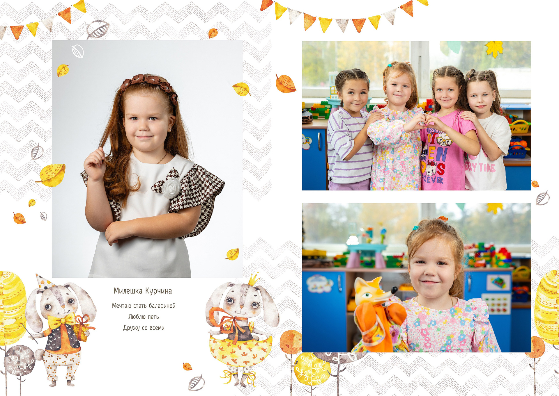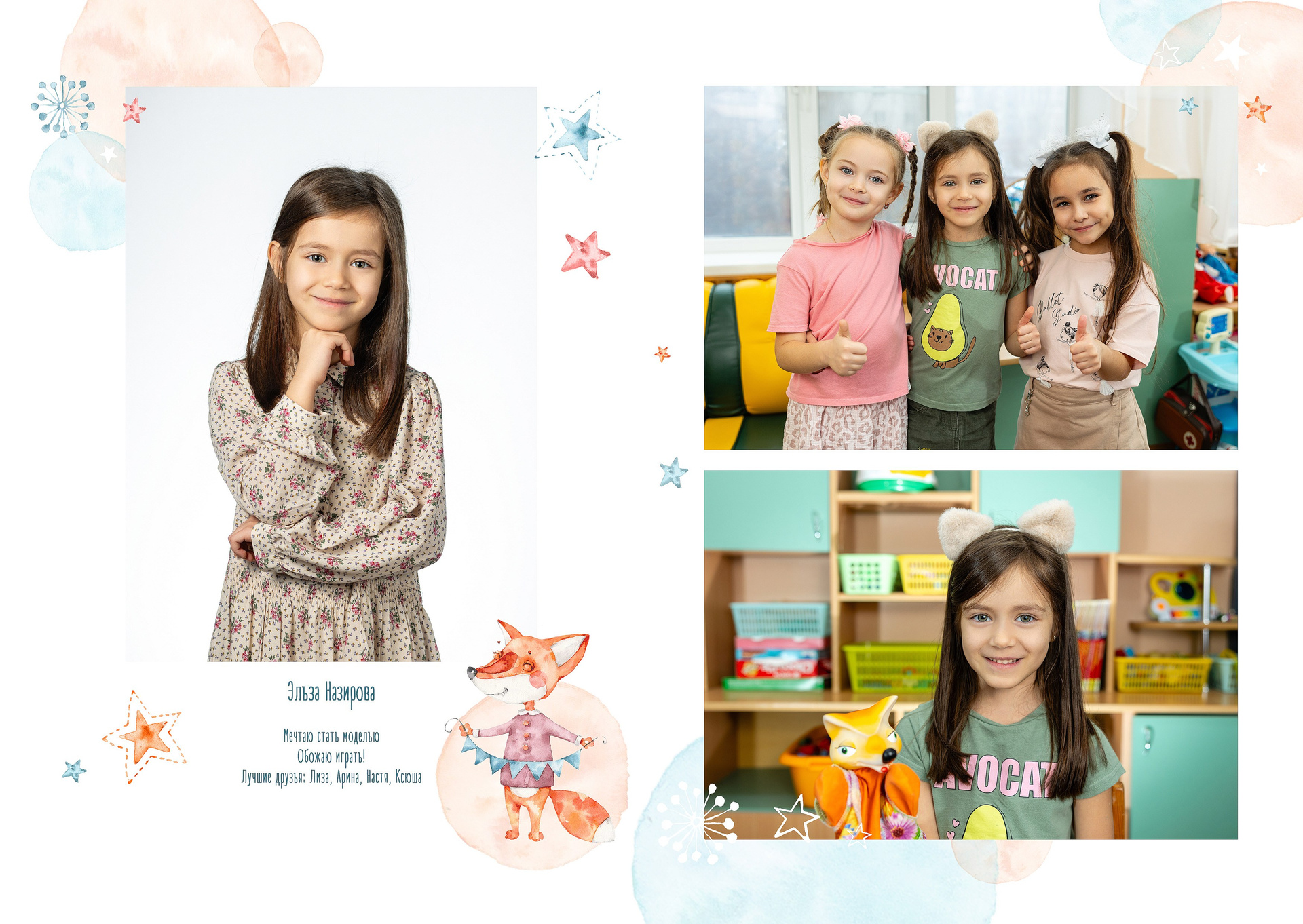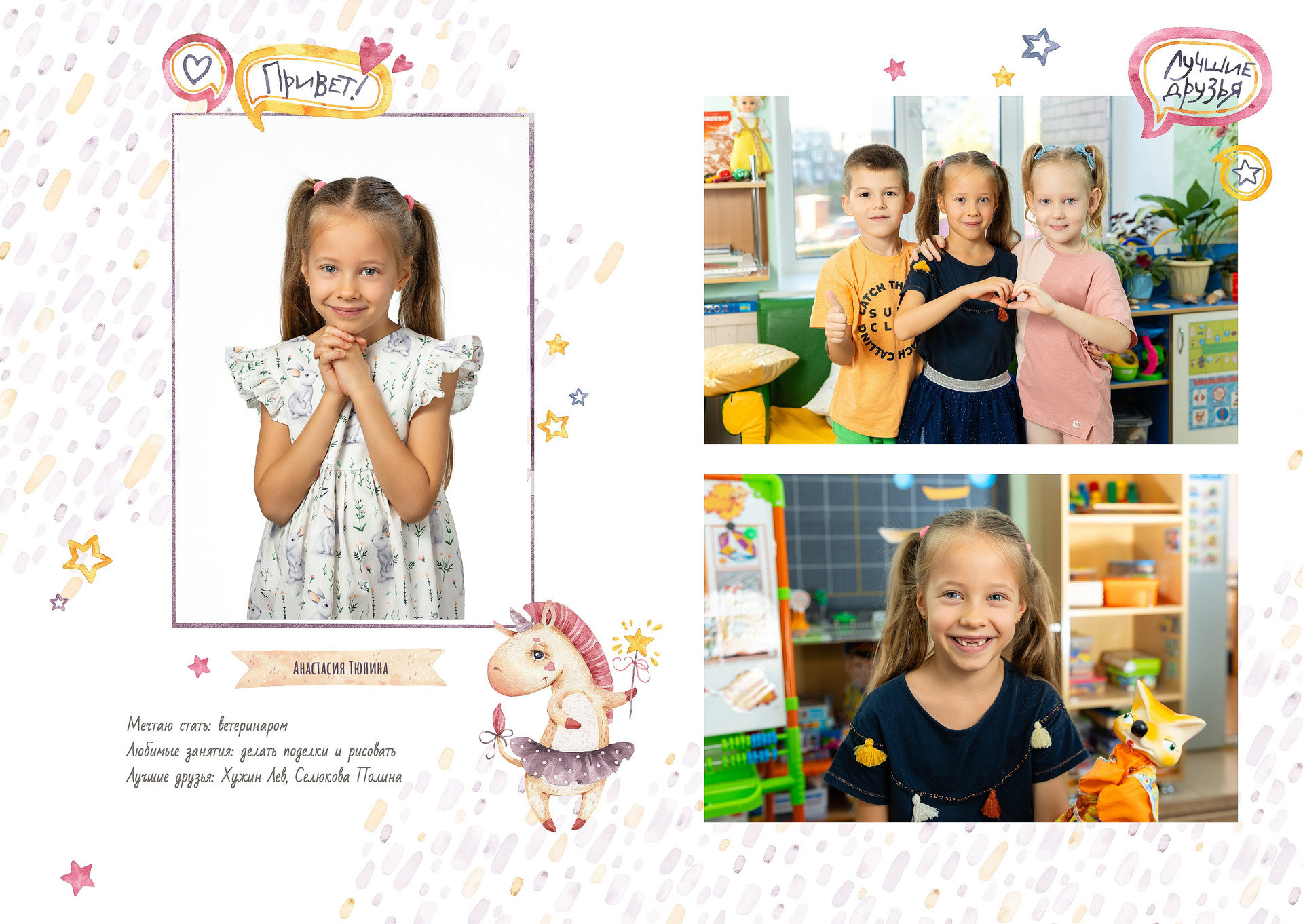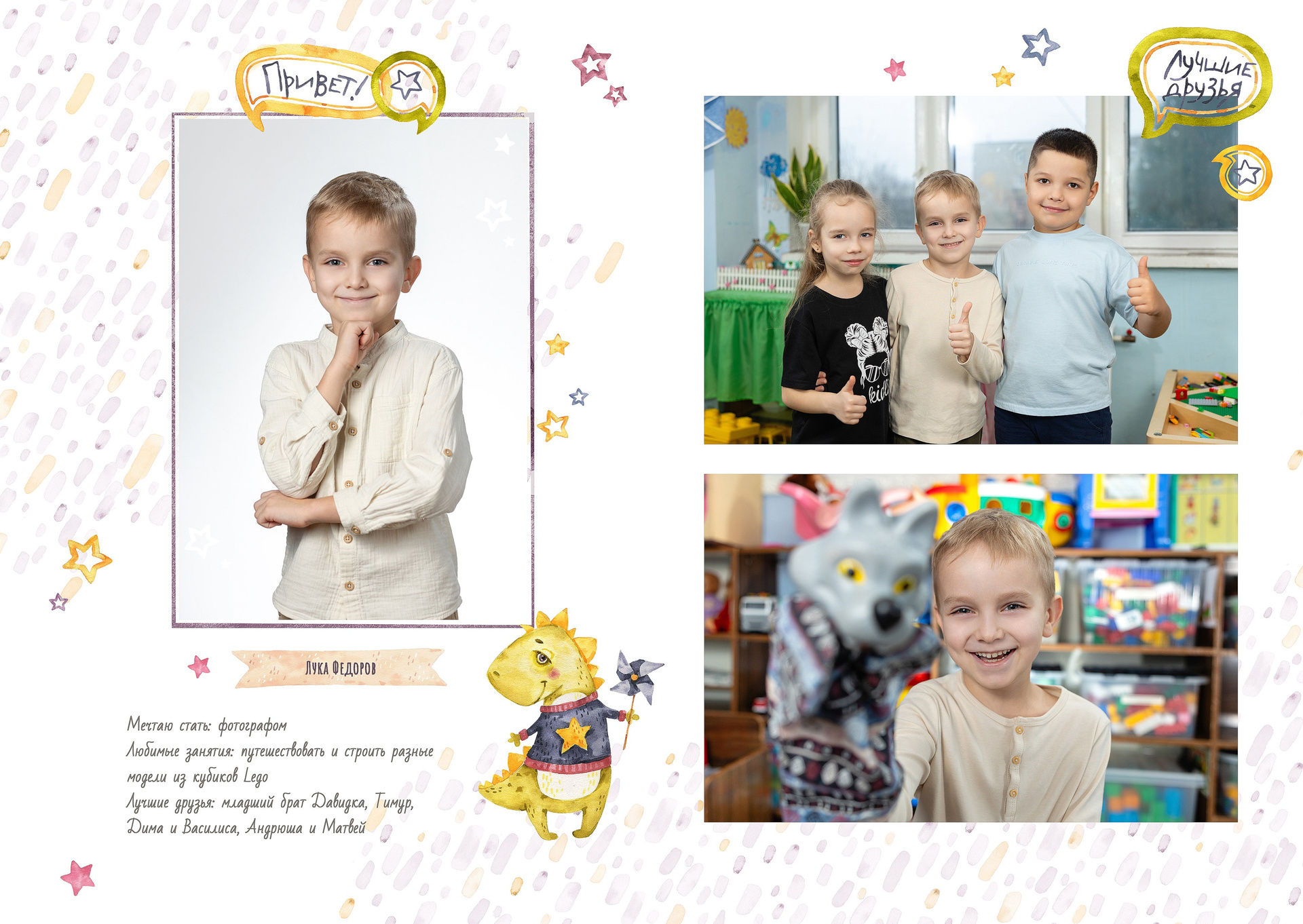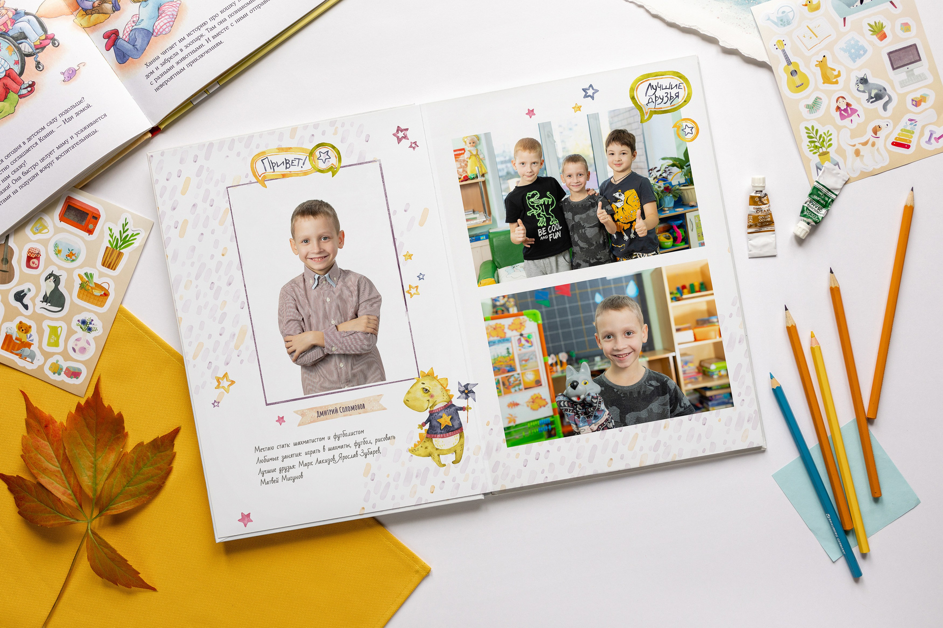 — 1-й разворот: портреты ребенка, анкета, фотографии с его друзьями