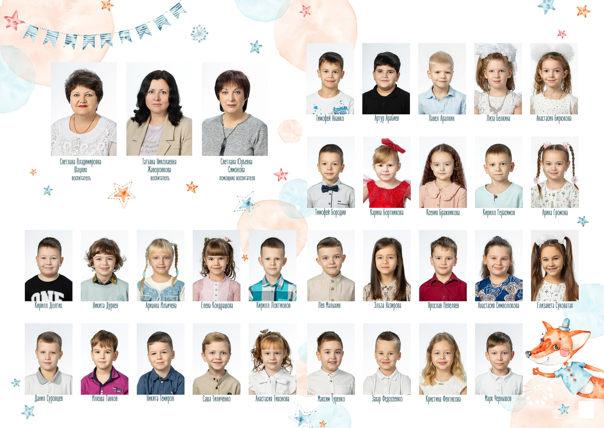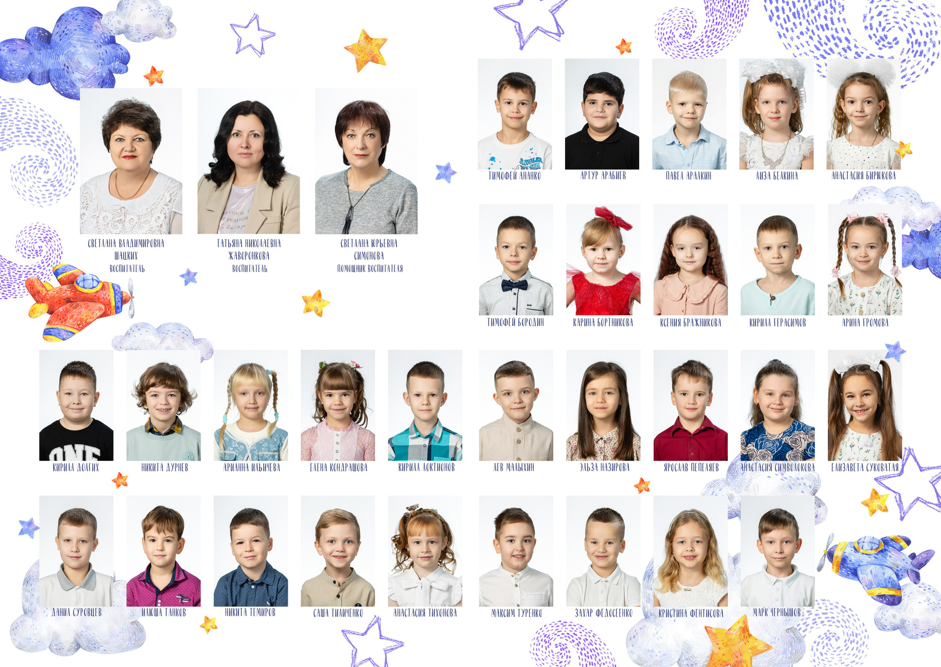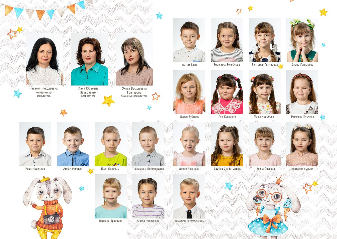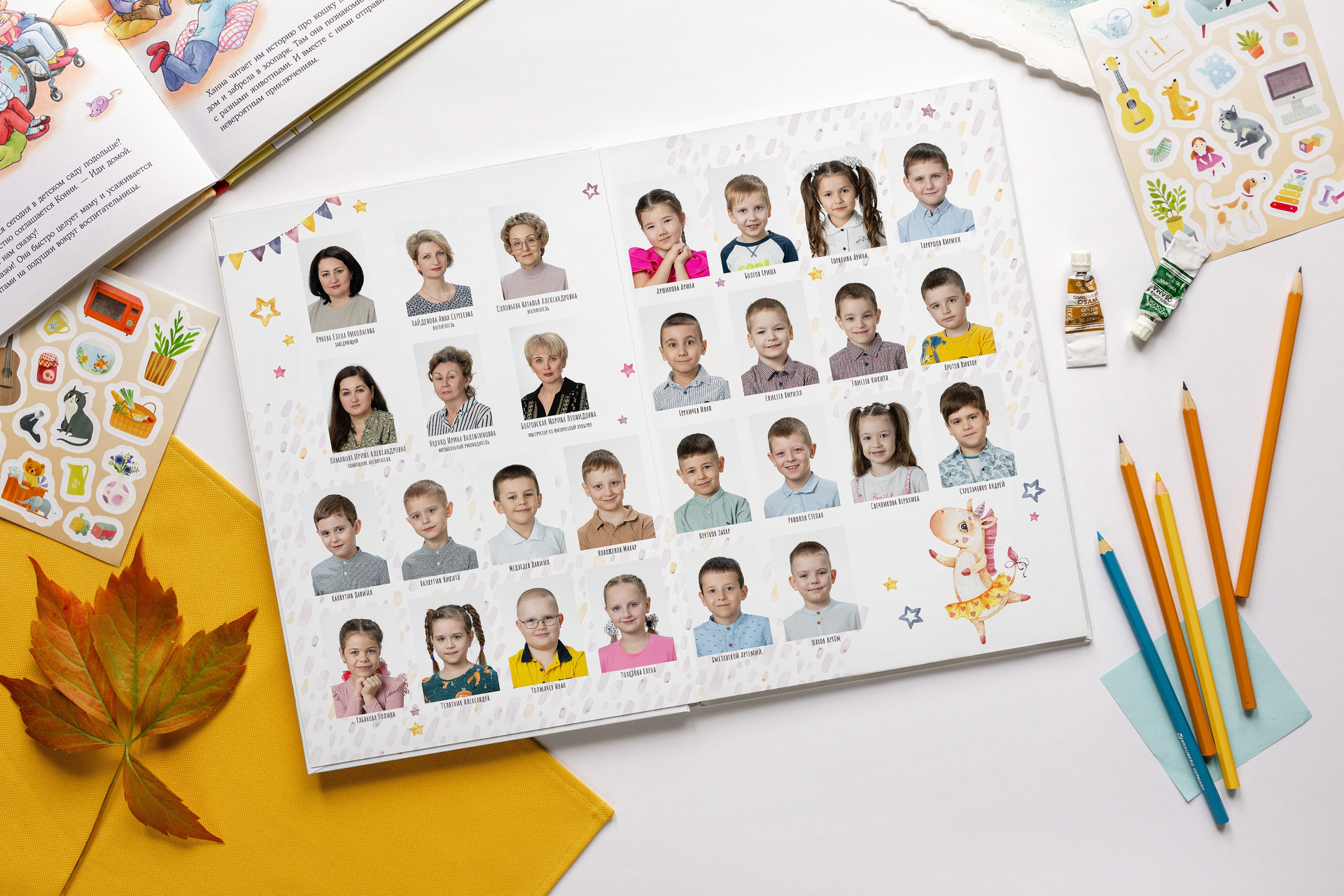 - 2 страницы — групповое фото (коллаж из портретов с именами детей и педагогов)