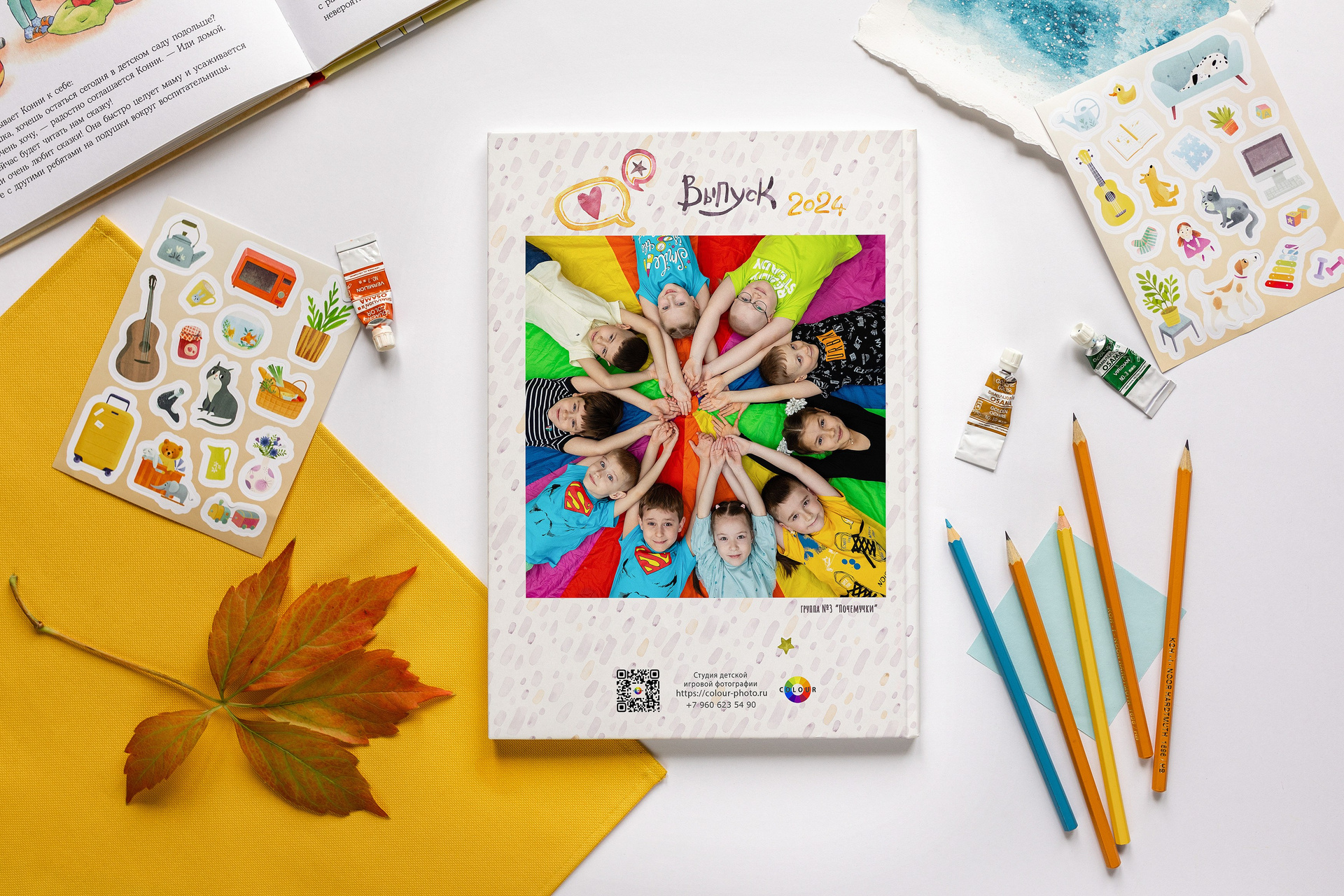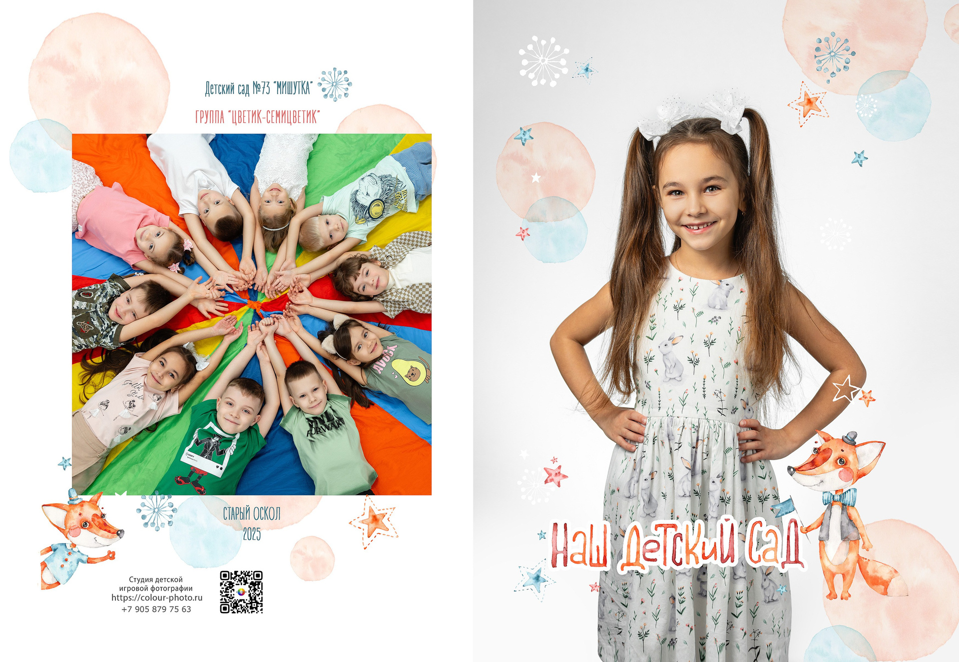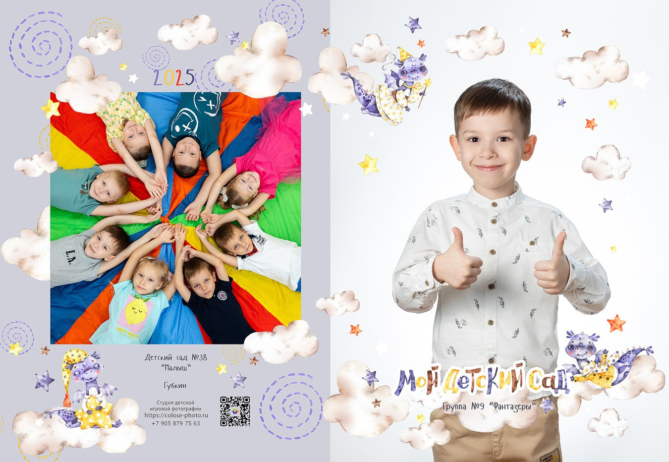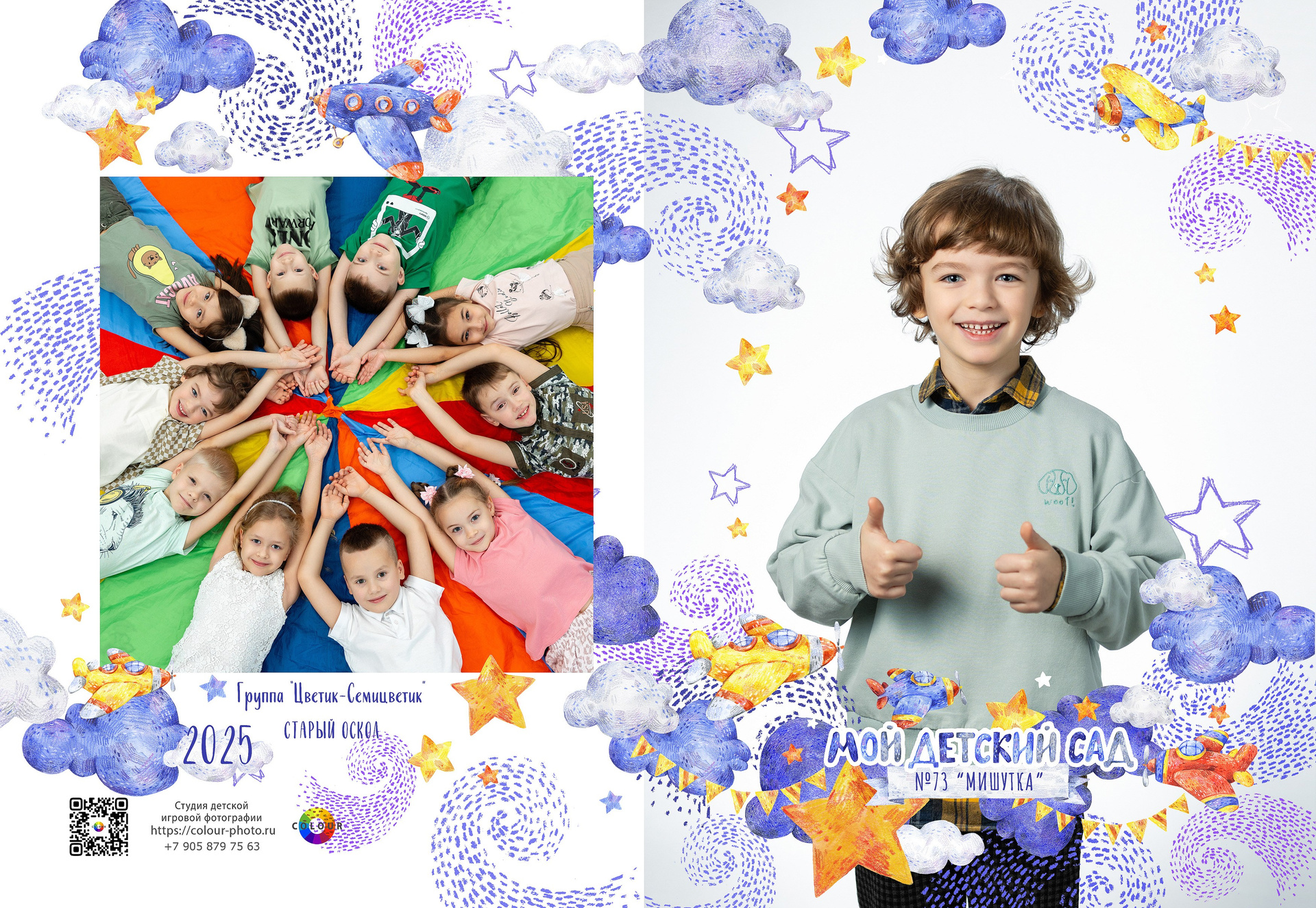 - 2 страницы — групповое фото (коллаж из портретов с именами детей и педагогов)