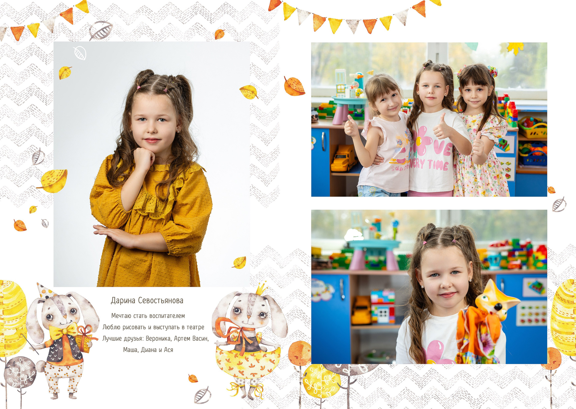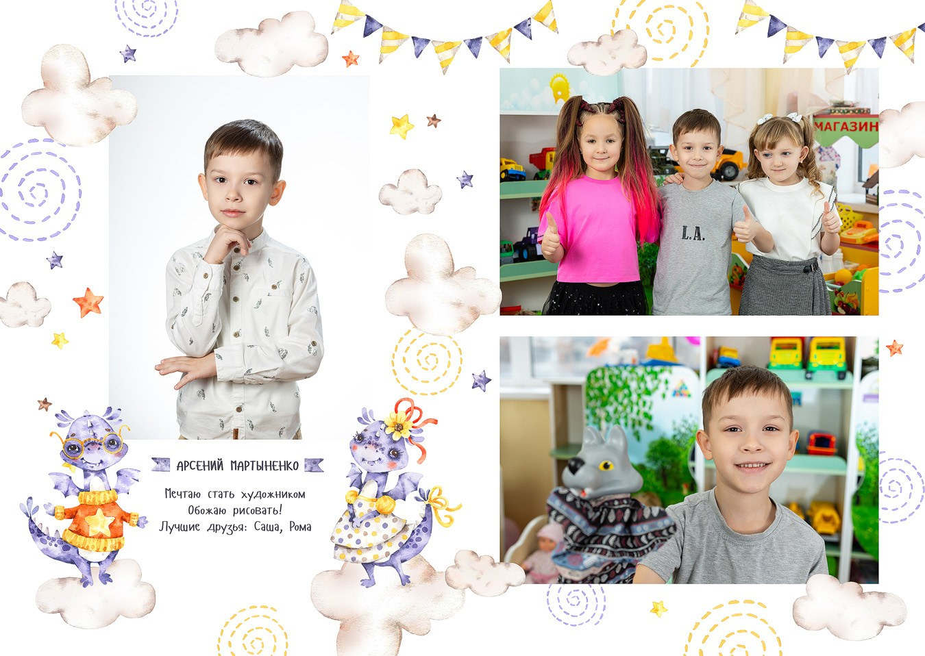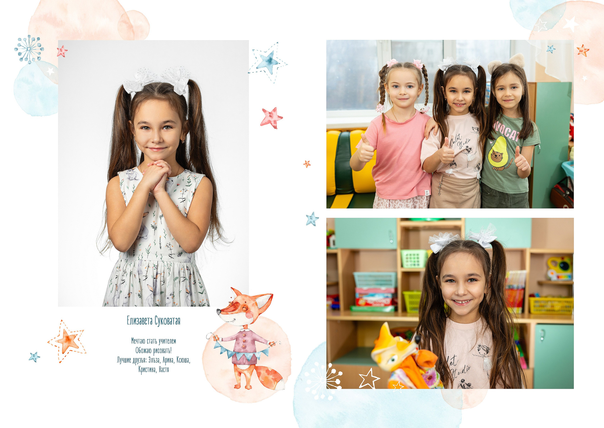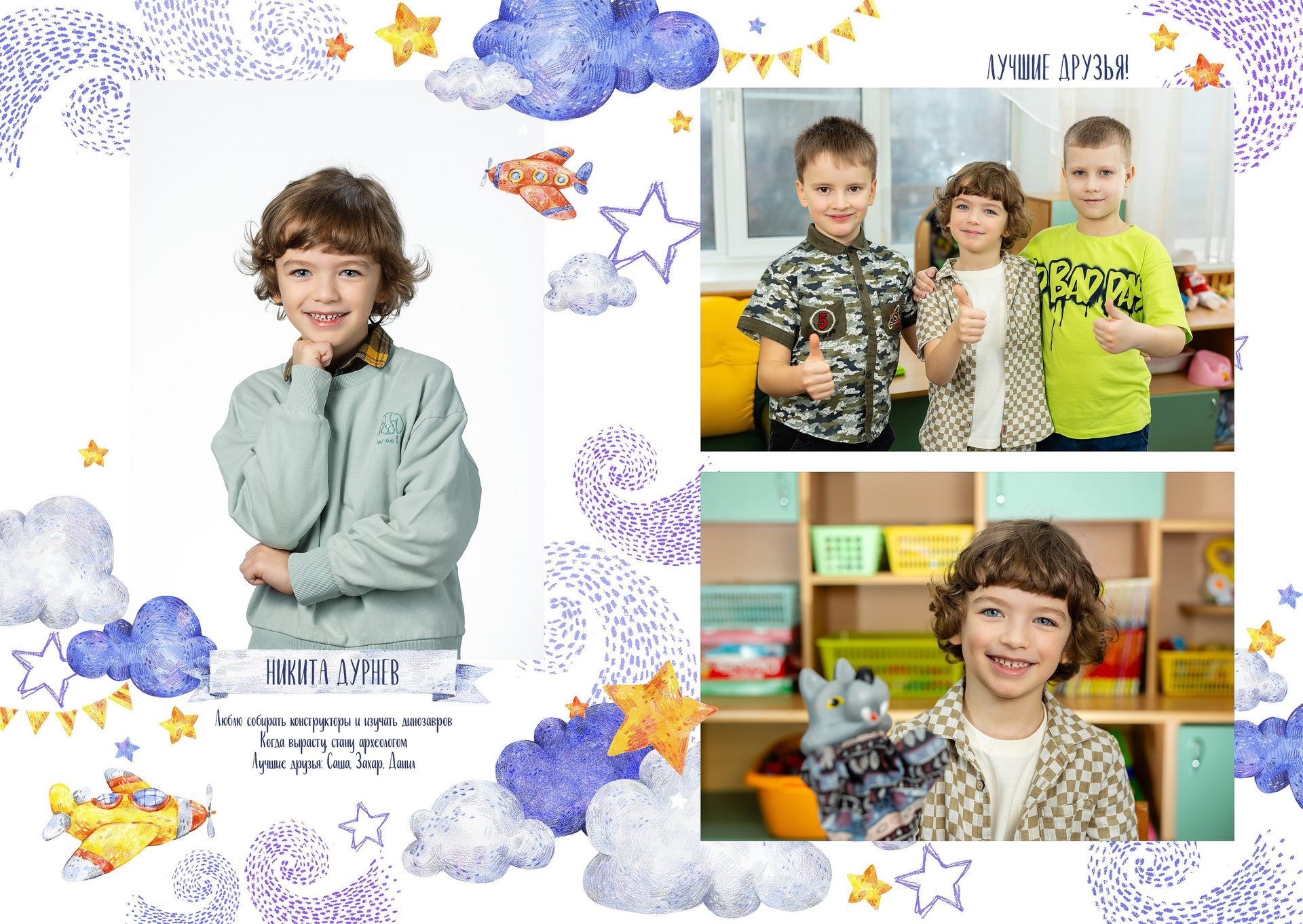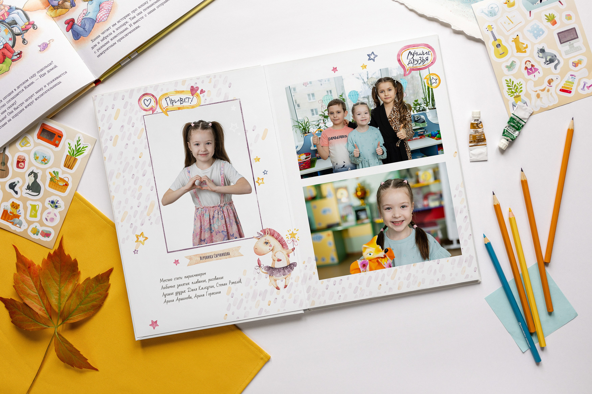 - 1-й разворот: портреты ребенка, анкета, фотографии с его друзьями