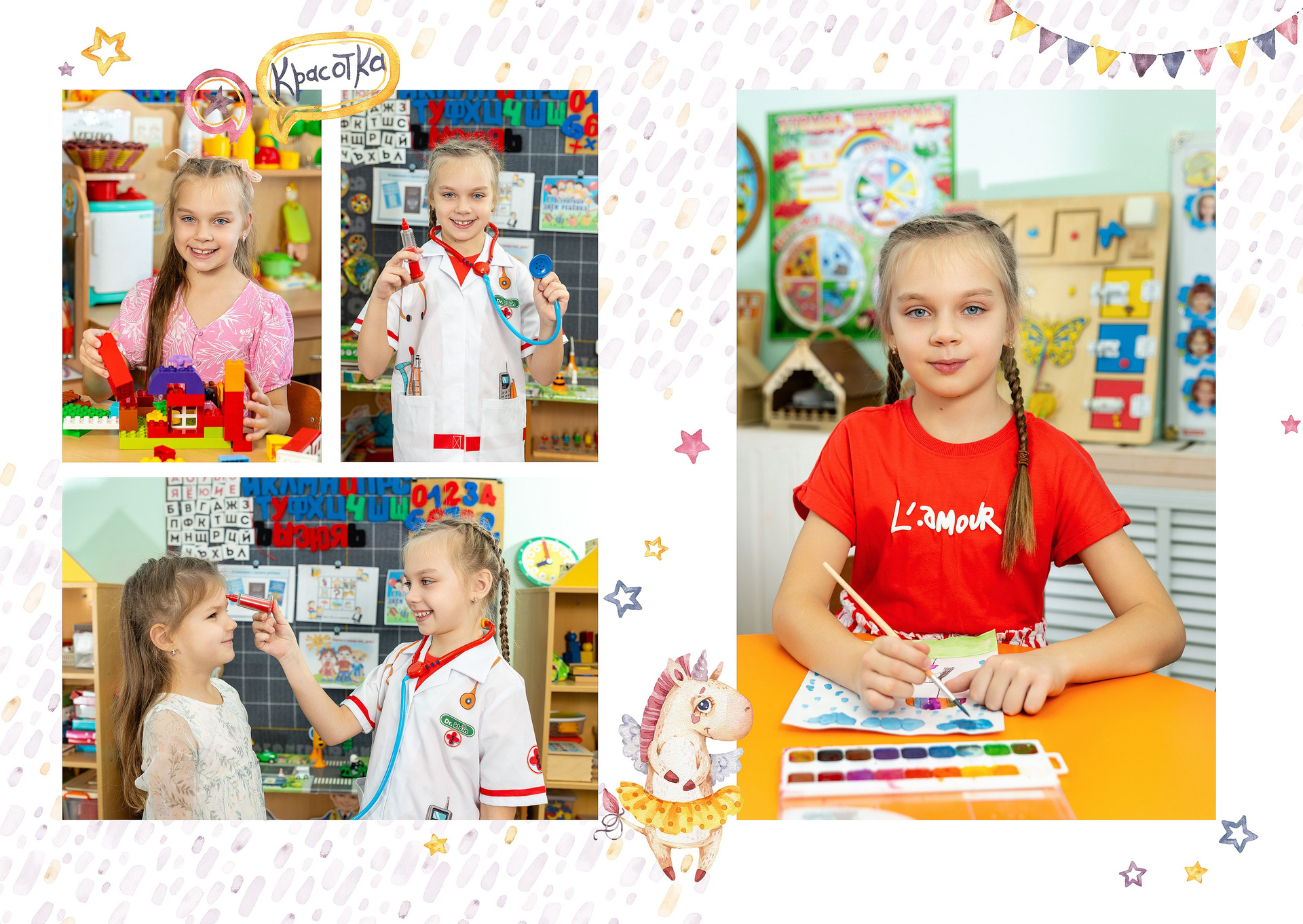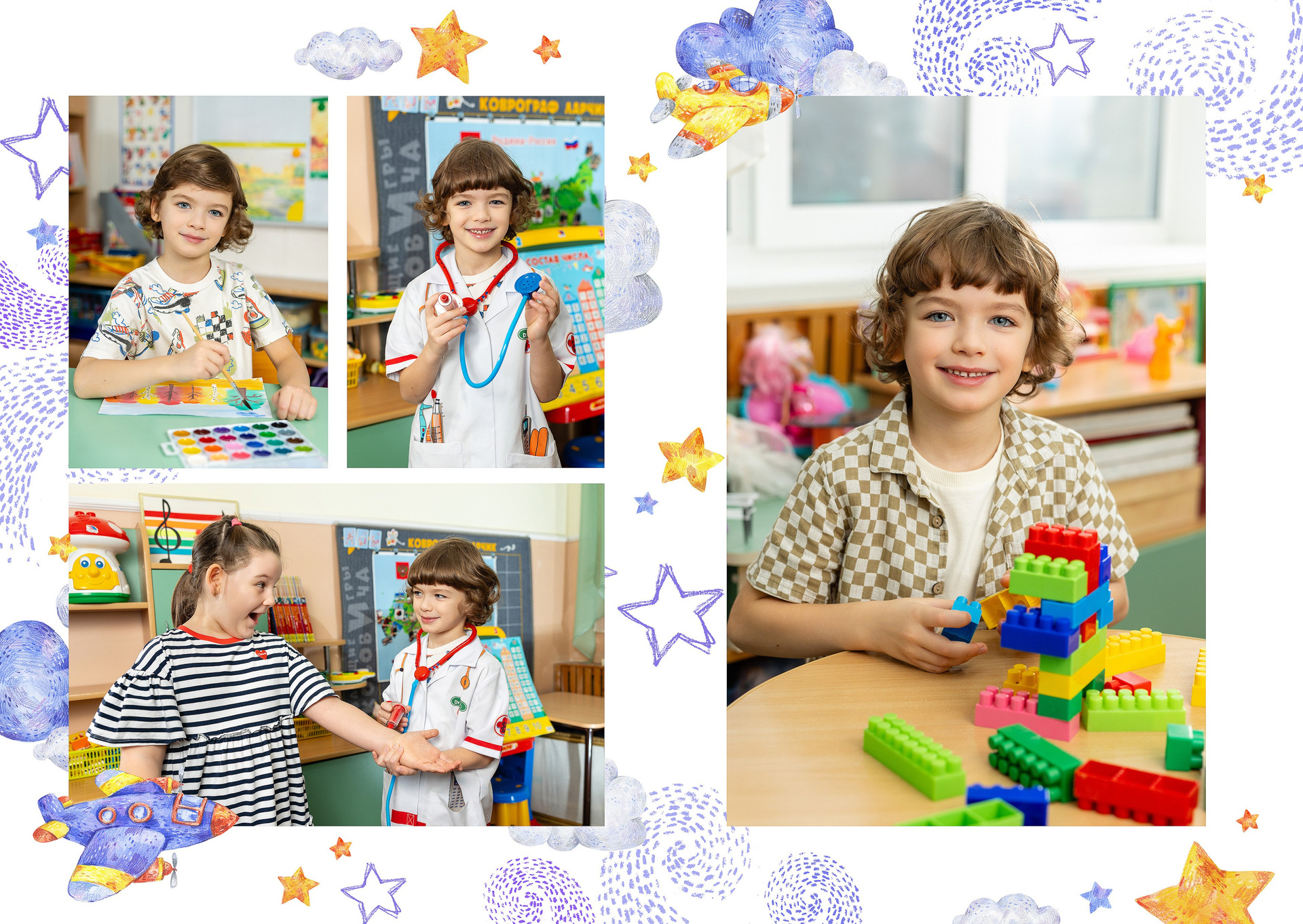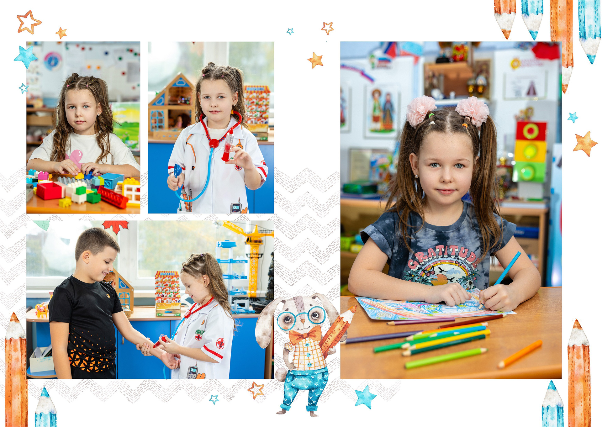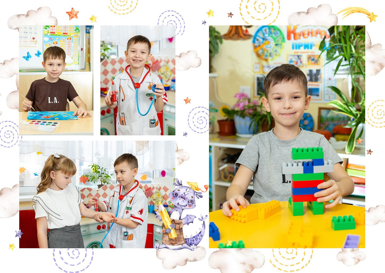 - 2-й разворот: фотографии на занятиях и играх в группе
